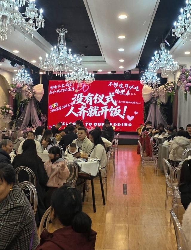 婚礼现场的屏幕上,直接写明了“没有仪式,人齐就开饭”,显得既热闹又喜庆。