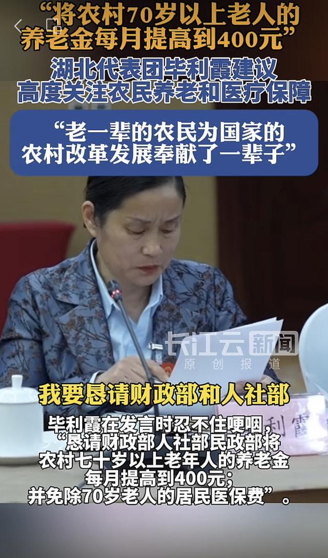 在她的发言中,毕利霞指出,许多老一辈的农民已经到了退休年龄,身体状况不佳,养老金水平较低。这些老年人每月仅能领取约100元人民币的养老金,这使得他们在面对日益增长的医疗费用时感到力不从心。她还提到,在走访多个地区后发现,不少地方存在农村老人养老保障不足、看病负担过重的问题。因此,她呼吁财政部、人力资源和社会保障部以及民政部门能够采取措施,如将70岁以上老年人的基本养老金提高至每月400元,并免除这些老人的居民医疗保险费用(合作医疗)。