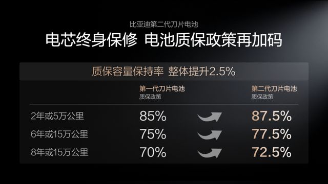 通过打造“锂离子高速通道”和“全温域智能热管理系统”,第二代刀片电池实现了更低发热量以及更高效均匀散热的效果,对延长电池寿命几乎没有影响。基于此技术优势,比亚迪宣布将电池质保政策进一步提升:容量保持率整体提升了2.5%,电芯依旧实行终身保修。