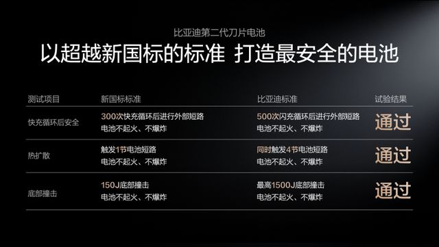 第二代刀片电池在安全性方面也达到了行业领先水平,成功通过了多项超越国家标准的安全测试,确保了电池在整个生命周期内的安全可靠性能,消除了用户的担忧。