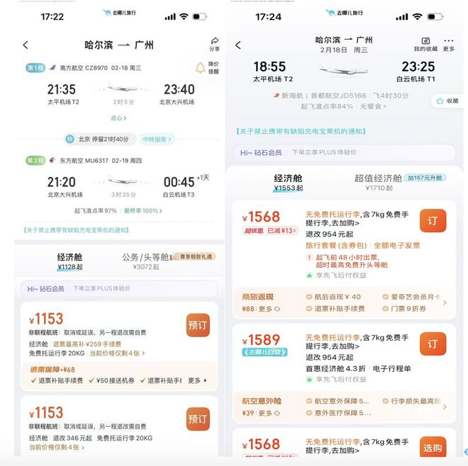 比如大年初二从哈尔滨到广州,在北京中转停留21小时的超长中转航班,机票价格比直飞便宜400元。这类转机时间超过12小时、票价比直飞更低的超长中转航班,预订量同比去年增长了三成。