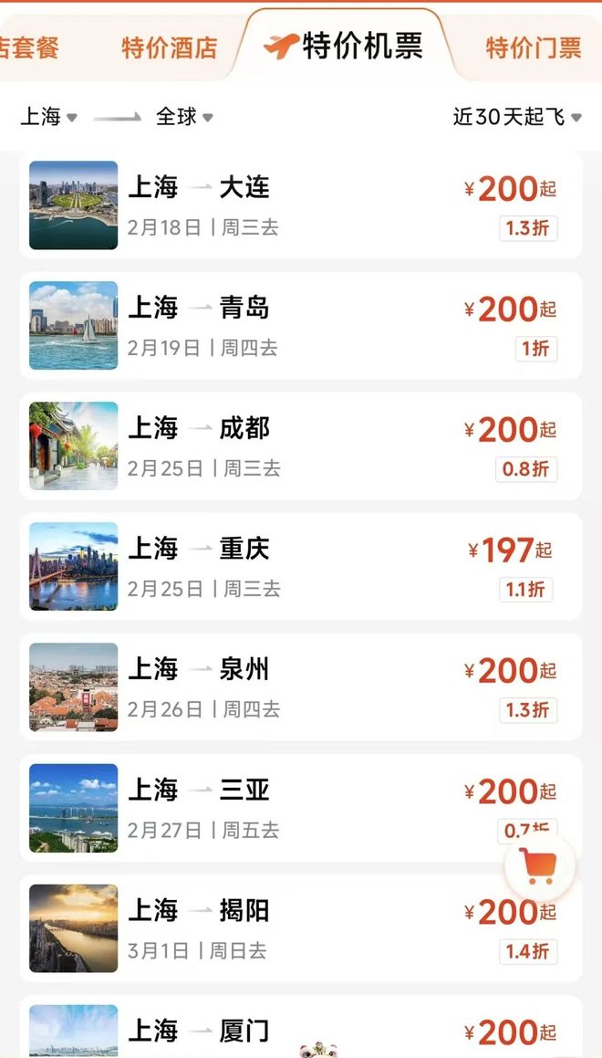 小坊2月17日晚搜索旅游APP发现,近日从上海出发的多条航线机票折扣力度的确很大,单程200元起,最高降幅达76%,低至一折起。
