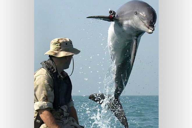 2003年,在波斯湾地区执行扫雷任务时,一只佩戴追踪装置的美国海军海豚参与了行动。