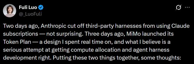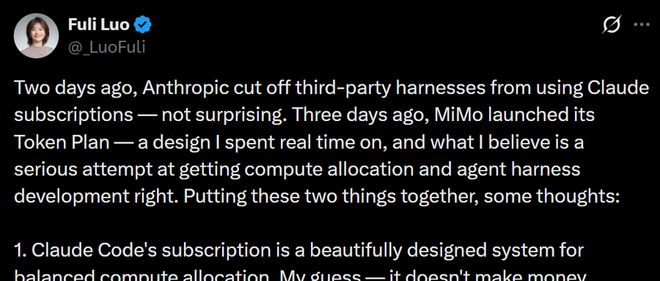 在4月6日,Xiaomi MiMo的大模型项目负责人罗福莉于社交平台X上发表了一篇文章,对Anthropic近期采取的新措施进行了评论,并对其Token Plan策略进行了解释。她在文中详细探讨了算力分配和定价逻辑的问题。