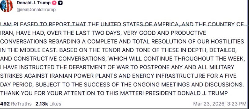 比特币价格对特朗普关于与伊朗进行“非常富有成效”的对话后,暂停对伊朗电力设施和能源基础设施的军事打击五天的声明作出积极反应。