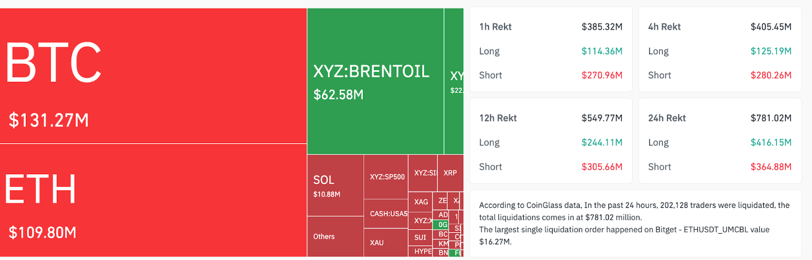 过去24小时内,全加密货币市场的总平仓量上升至7.81亿美元。