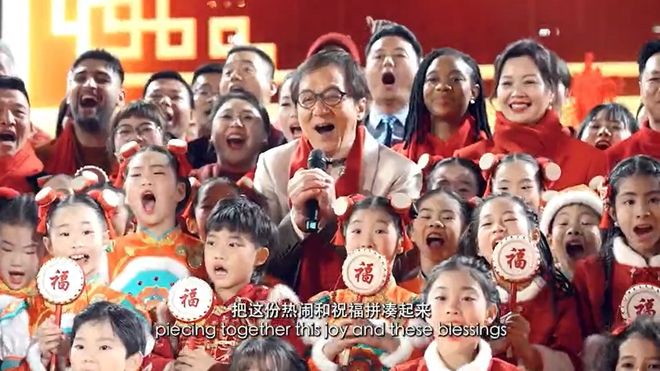 今年春晚,成龙出现在义乌分会场,身边都是小朋友,还有不少国际友人