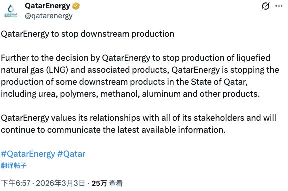 在北京时间周二晚间,卡塔尔能源公司宣布将停产范围扩大到其国内生产的多种下游产品,包括尿素、甲醇、聚合物和铝等。