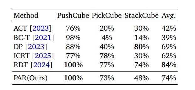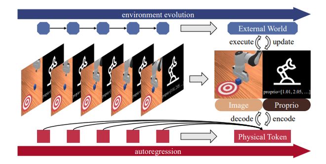 PAR则采用相反的方式:将视频帧与机器人动作编码为同一「物理token」,使模型在同一自回归过程中,既预测「未来环境状态」,也同步输出「机器人动作」,这与人类「眼手协调」的直觉高度契合。