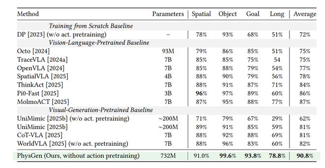图3展示了732M参数、在零大规模动作预训练前提下,Physgen取得平均90.8%成功率。