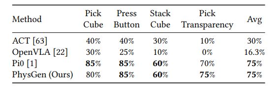 在最考验物理感知的透明物体抓取任务中,PhysGen超越了需要大规模预训练的π0模型——这说明从视频中学到的物理直觉,在处理「视觉欺骗性强」的场景时更具优势。