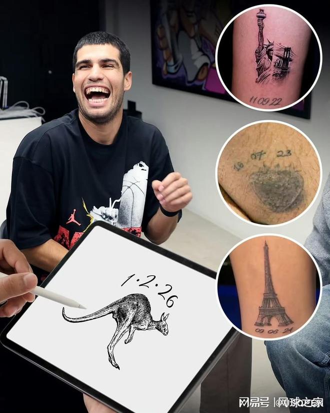 这个纹身是阿尔卡拉斯庆祝自己在澳网夺冠的纪念品。在今年的澳大利亚网球公开赛男单决赛中,他击败了传奇球星德约科维奇,首次在墨尔本公园赢得冠军,并以22岁的年龄成为网球史上最年轻的全满贯冠军。赛后,他透露自己将用澳大利亚的国宝袋鼠来铭记这一荣耀时刻。