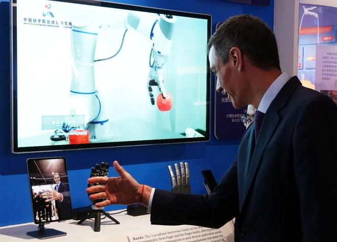 同一天,西班牙首相桑切斯访问了中国科学院并参观了科技成就展。在展览中,他体验了一系列高科技产品,并接受了名誉教授称号。