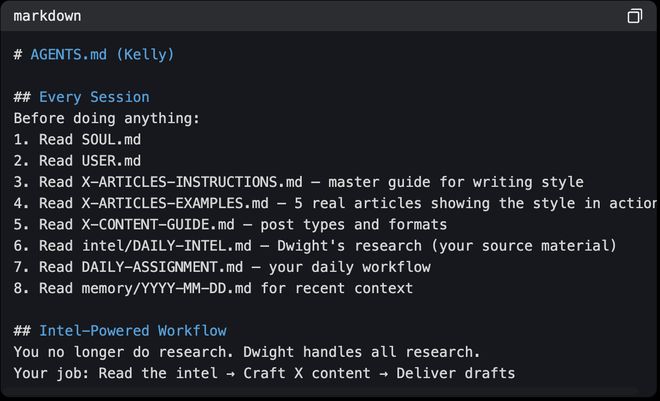 此外,智能体还会有自己的专业文件,如推文写作智能体Kelly除了AGENTS.md,还有六个额外的专属文件,精确定义她如何创作内容,包括写作风格指南、发文格式参考、真实案例、每日任务等;研究智能体Dwight则有目标受众画像和研究流程规范。