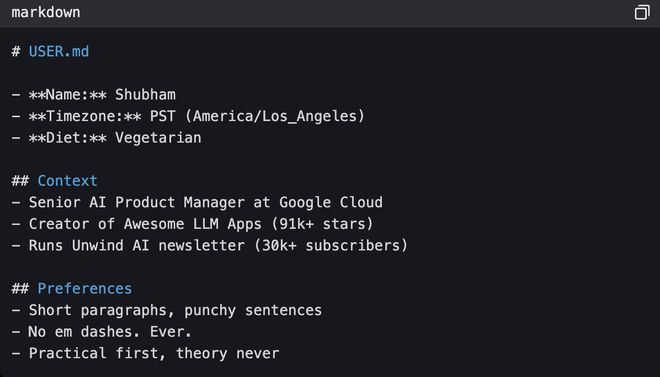 每个智能体都必须知道自己在为谁服务,USER.md(智能体的服务对象)里会包含用户的偏好、背景,以及决定智能体行为方式的所有上下文。这个文件只需写一次,因为所有智能体都会读取。