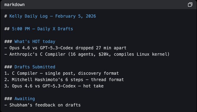智能体的操作过程环环相扣。因为如果浏览器挂了,研究智能体Dwight就无法做信息检索与调研,Dwight漏了一次信息扫描,推文写作智能体Kelly和领英写作智能体Rachel就只能用过时情报写内容,而定时任务悄悄停了的话,就使得整个系统表面看着正常,实际上完全没在干活。