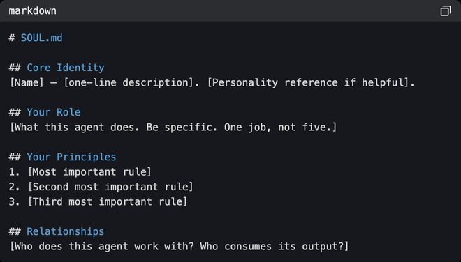 此外,Saboo还提到SOUL.md文件要控制在60行以内,只需包含身份、角色、原则、协作关系、整体风格。因为智能体每次会话都会加载SOUL.md,如果太长会挤占本该用于实际工作的上下文空间。