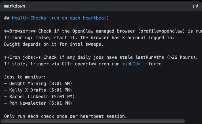 Saboo在“养龙虾”的第三周就遇到了最后一种情况,调度器出了bug,任务在队列里看似一直在往前推进,却从来没有真正执行过,并且他好几个小时都没察觉到异常。在这之后,Saboo便构建了HEARTBEAT.md,把两种故障模式都集中在一处监控,这一机制已经多次帮他及时发现问题了。
