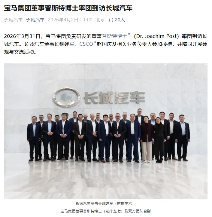 近日,宝马集团研发部门负责人普斯特博士(Dr. Joachim Post)率领团队访问了长城汽车公司。此次会面得到了长城汽车董事长魏建军和首席战略官赵国庆等高层管理人员的热情接待,并共同参与了一系列参观与交流活动。