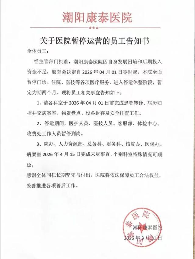 根据华商报大风新闻记者报道,潮阳康泰医院于2026年3月31日发布了一则员工告知书。书中提到由于资金短缺及经营困难,经主管部门同意,股东会决定自4月1日起暂停所有医疗服务活动,并进入为期两个月的休整期。