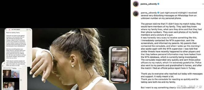 几天前意大利选手斯特凡尼尼披露了收到死亡威胁的消息后,匈牙利排名第95位的女选手乌德瓦尔迪近日也在参加WTA125赛时遇到了类似的情况。