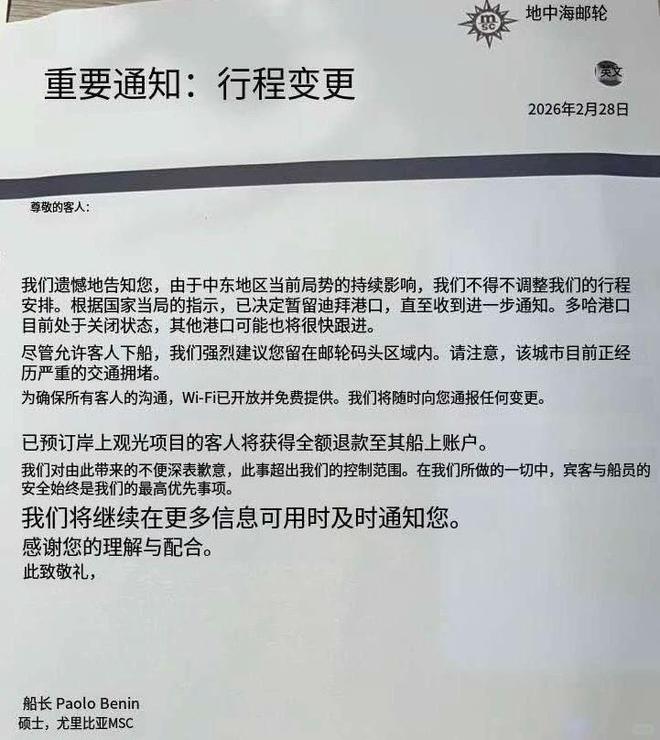 这位乘客展示了一份由邮轮船长签署的停航通知,内容提及:“鉴于中东地区当前局势的影响,我们不得不调整我们的航行计划。根据国家当局的指示,决定暂时停留在迪拜港,直至收到进一步的信息。”