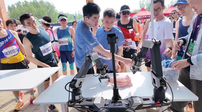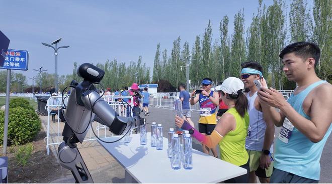 赛道沿线设置了四个补给点,均由星海图的机器人负责服务。这些人形机器人能够自主地在动态的人流中进行递送工作,确保了运动员可以及时获得饮用水和毛巾等补给品。