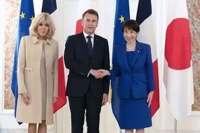 马克龙夫妇在访日期间与高市早苗合影