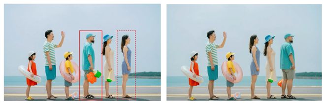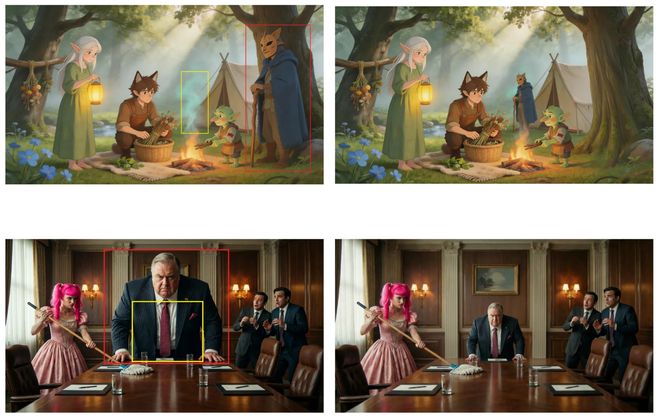 官方演示中,用户框选图中两个人物后输入“互换位置”指令,模型准确完成了人物交换,且背景及其他元素保持不变。