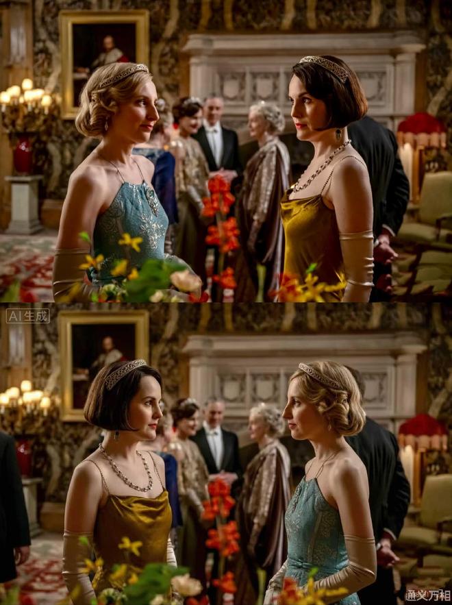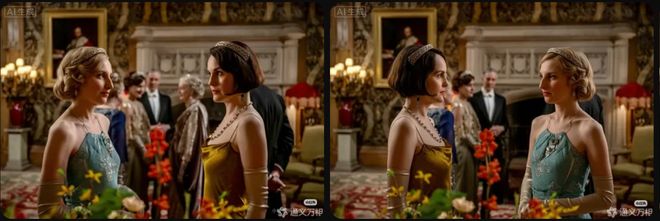 除了人脸生成外,Wan2.7-Image还展示了一项重要的交互编辑功能:在保持场景背景不变的情况下,可以自由调整人物位置和大小。例如,在《唐顿庄园》电影图片中,模型能够顺利完成两位角色站位互换的任务。