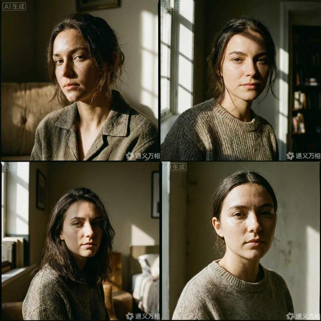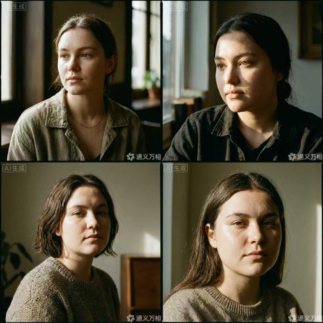 通过使用基础指令词“年轻女性半身像,电影质感光影,高清细节,真实皮肤”,该模型能够一次性输出四张各不相同的肖像画。每幅图在面部轮廓和细微特征上都有独特之处,并且背景光线处理得当,整体效果非常逼真。