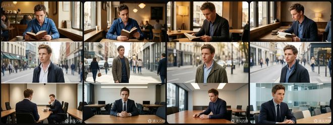 从输出结果来看,模型精准保留了参考人物的核心面部特征、发型轮廓与整体气质,在咖啡馆、户外街拍、正式会议室三大场景中,人物主体的辨识度始终稳定,未出现五官变形缺陷。