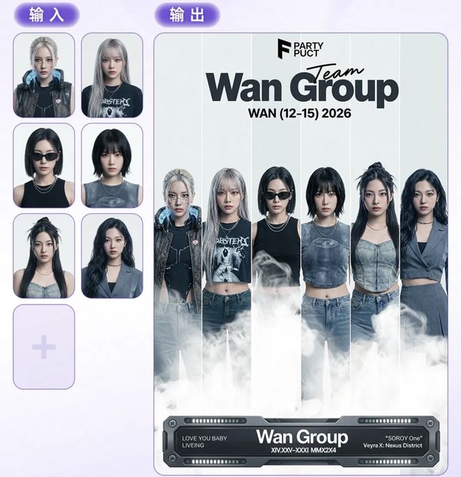 多主体一致性是图像生成中难度较高的任务。Wan2.7-Image在这一方向支持最多9图的风格与特征统一,可用于合影生成、电影海报及家具组合图等场景。官方展示了AI女团海报和家具组合图的生成效果,多人物之间的风格一致性较高。