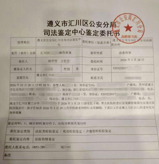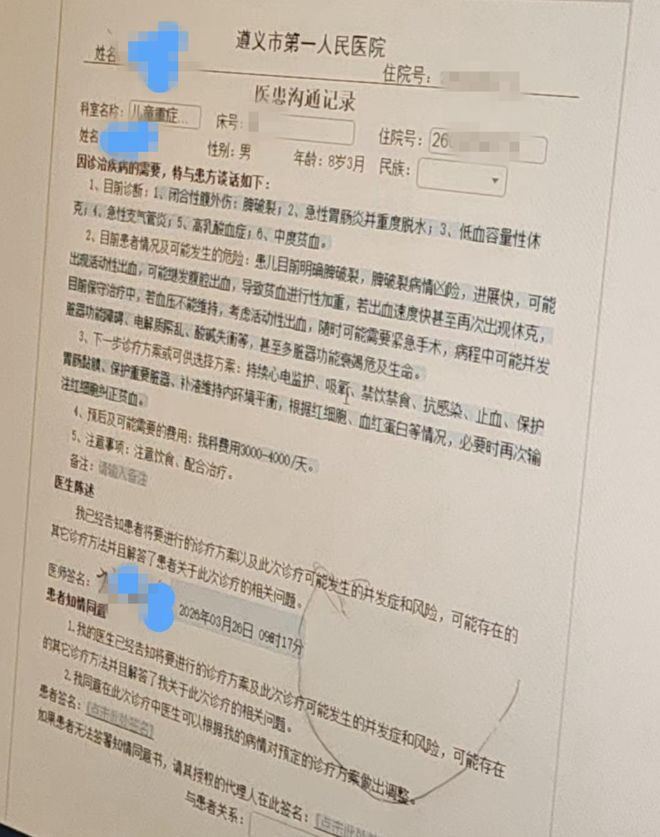 小轩的母亲杨女士称,她的儿子就读于遵义市汇川区第三小学二年级。事发当天因肠胃不适被带去看医生,并未发现异常。直到几天后孩子病情恶化才紧急送医抢救,随后检查出脾脏破裂出血。