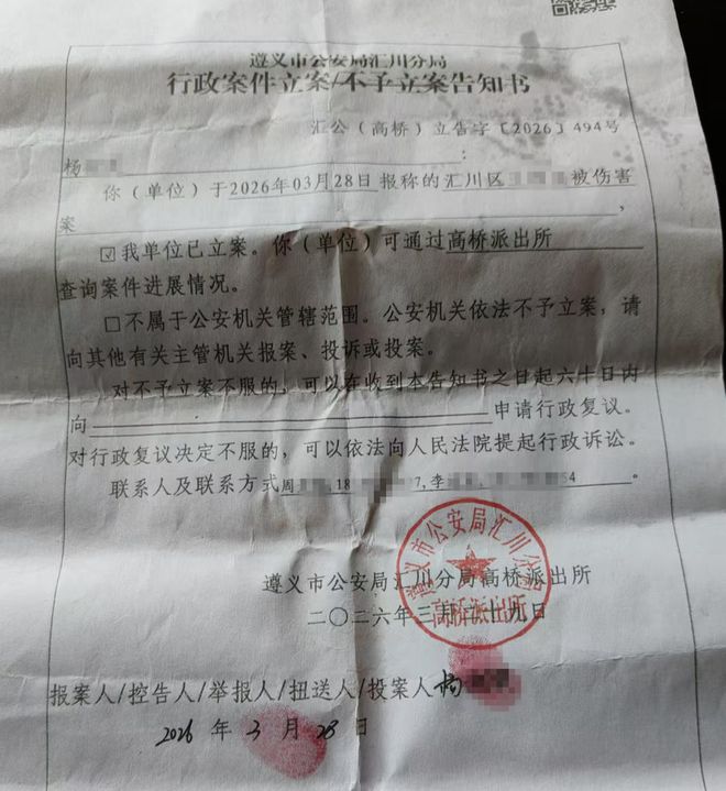 根据警方提供的立案告知书显示,遵义市公安局汇川分局高桥派出所于3月29日对杨女士报案的案件正式立案处理。