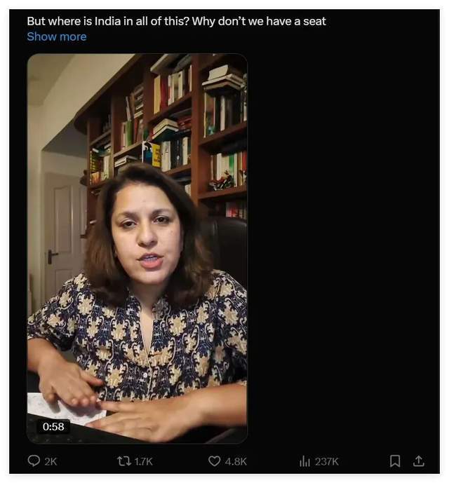 有的印度人选择斥责印度政府在外交政策上缺乏主动性。比如下图中这个印度媒体人发布帖文质问印度为什么被边缘化了。
