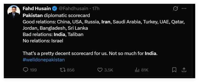 这一来自国际社会的密集关注,显然也让巴基斯坦的网民相当自豪。在海外社交平台X上,一位巴基斯坦记者在自己的账号上表示,巴基斯坦的朋友遍天下,既有中国、美国和俄罗斯,也有伊朗、沙特、卡塔尔,但印度就差远了。