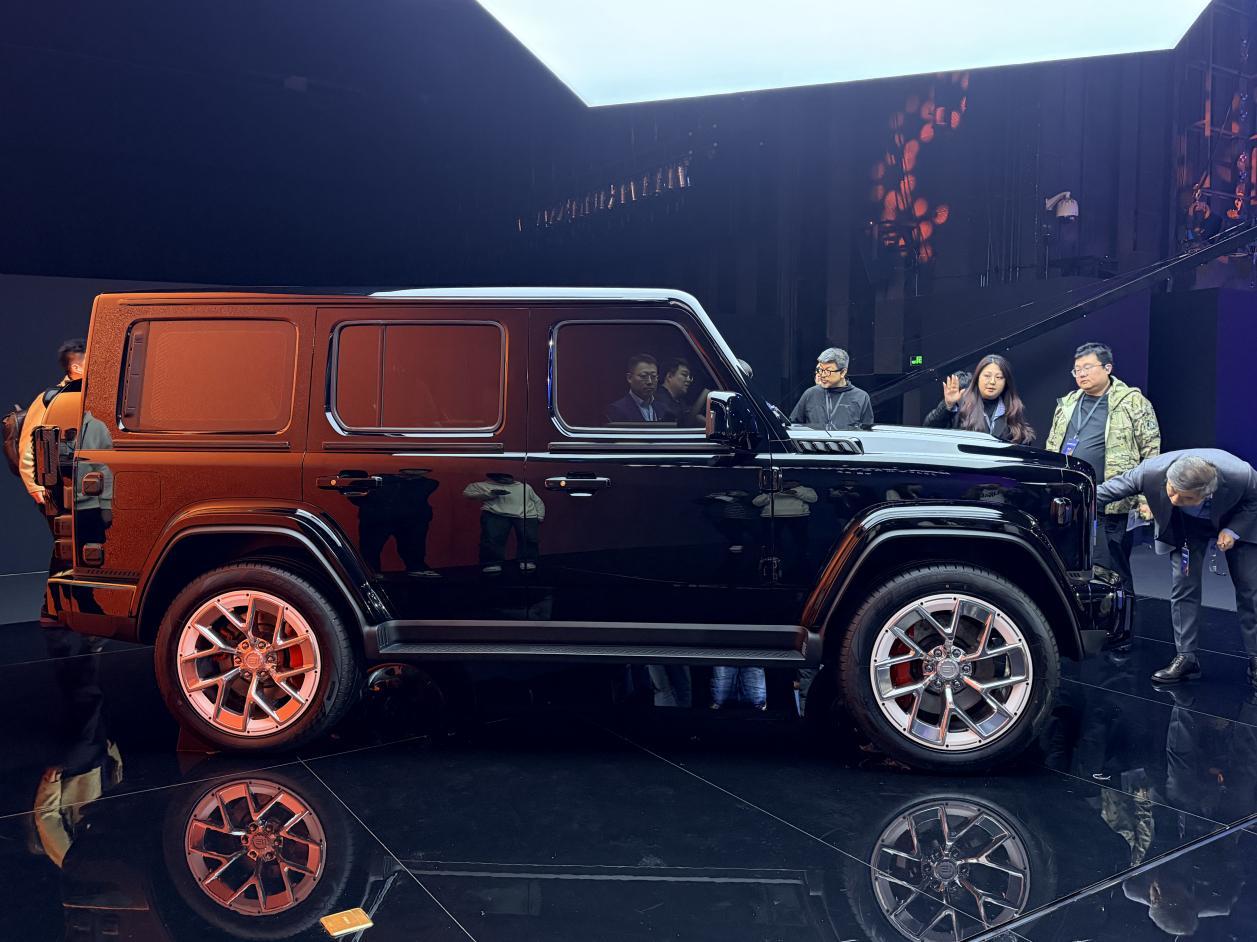 车身侧面设计包括宽体外扩轮眉、高离地间隙和平直的车顶线条,搭配305毫米宽度轮胎以及全新的轮毂样式。红色前六活塞和后四活塞高性能刹车系统提升了车辆的安全性能;而弹壳样式的门把手则进一步强化了整体氛围。