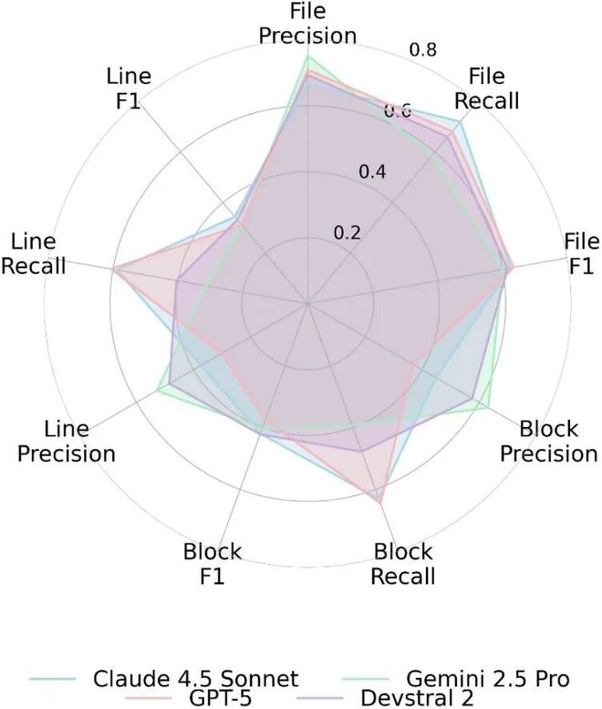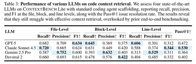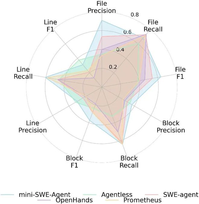 细粒度追踪:评测框架记录智能体的每一步操作轨迹,并在文件、代码块和行三个级别上计算检索精确率和召回率。这意味着模型的行为可以被量化为“定位能力”:不仅判断是否访问了关键文件,还能评估其对特定函数乃至具体语句的关键性。