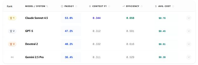研究团队使用ContextBench测试了当前最强的4款LLM和5种主流代码Agent框架: