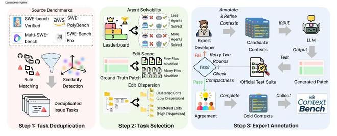 ContextBench并不是通过构造新的编程任务来实现这一目标,而是基于实际开源仓库中的Issue和补丁逆向追踪问题修复过程中所依赖的代码片段,并将其整理为评测所需的黄金上下文。其核心评价标准由是否成功修复转变为能否准确定位到关键代码。