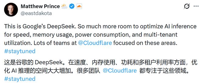 Matthew Prince,Cloudflare的创始人、首席执行官兼执行主席,将TurboQuant的发布视为谷歌的一个重要里程碑,类似于DeepSeek时刻。