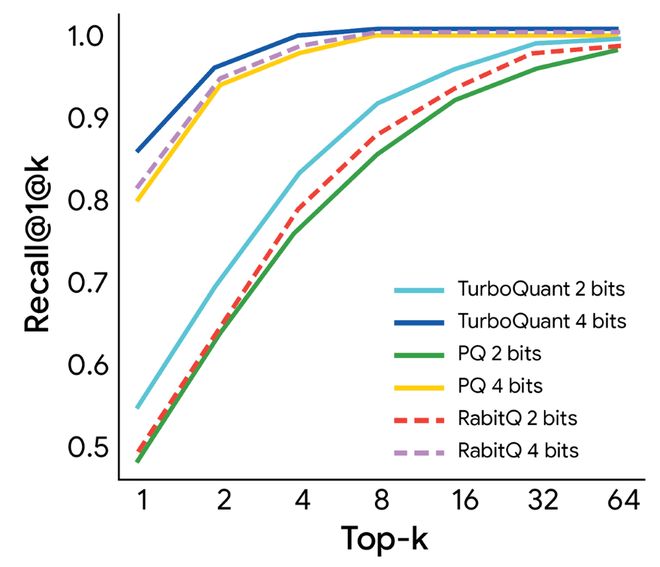▲TurboQuant的召回率图(横轴是检索范围,纵轴是召回率)(图源:谷歌官网)