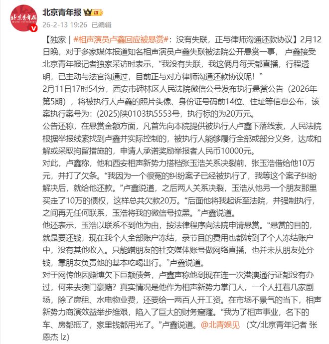 2月12日晚,对于多家媒体报道知名相声演员卢鑫失联被法院公开悬赏一事, 卢鑫接受北京青年报记者独家采访时表示,“我没有失联,我这俩月每天都直播,行程透明,已主动与法官沟通过,目前正与对方律师沟通还款协议呢!”