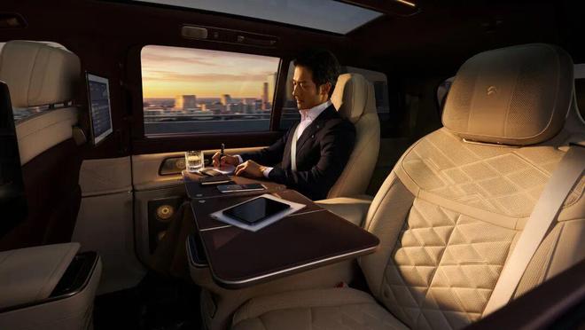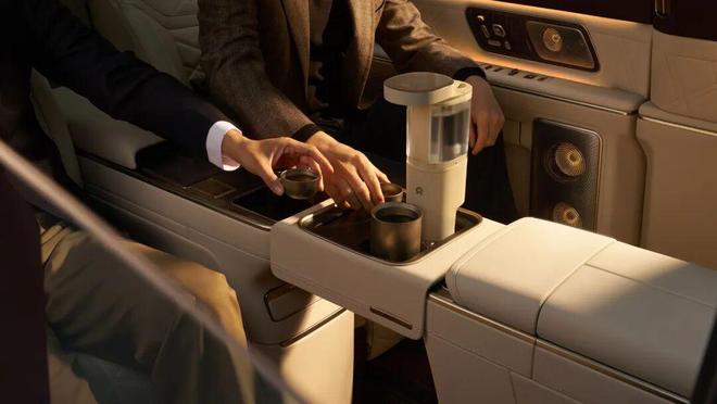在这个“商务行政中岛”区域设有两张折叠桌案,乘客无需弯腰就能使用;同时在脚踏区还安装了20点机械式足底按摩装置,并提供磁吸车载茶具作为选配项。这使得车内环境更具商务气息。