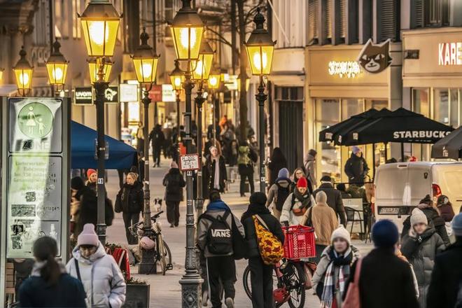 2026年一月,在德国慕尼黑的一条街道上,市民们正在进行日常购物活动。
