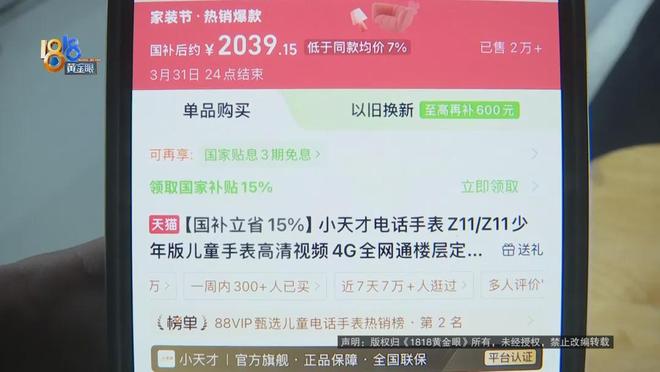 这款“小天才电话手表Z11”在官方旗舰店上的国补后价格约为2039元