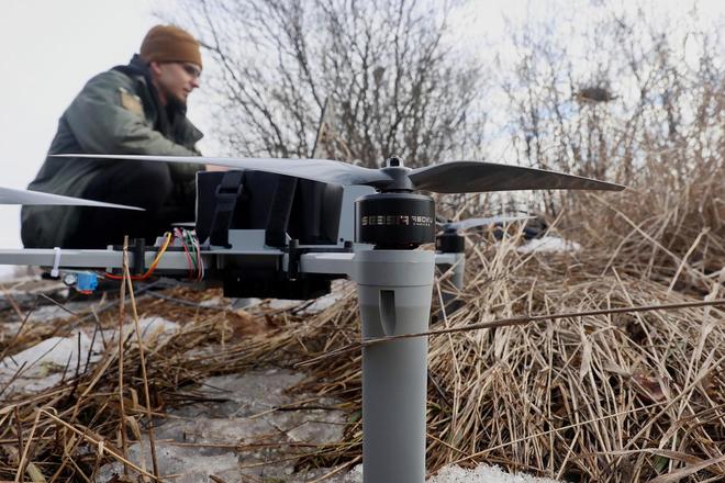 在乌克兰哈尔科夫地区的野外试验中,一名士兵正在测试地面控制站与大黄蜂无人机。