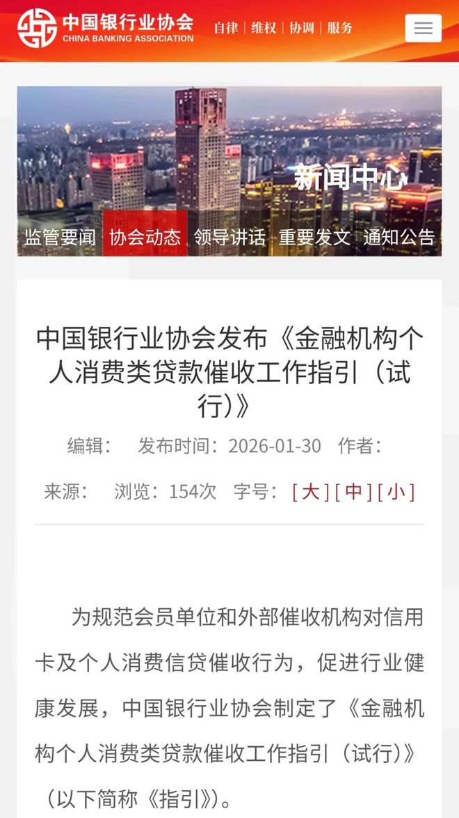 今年1月,中国银行业协会发布了《金融机构个人消费类贷款催收工作指引(试行)》