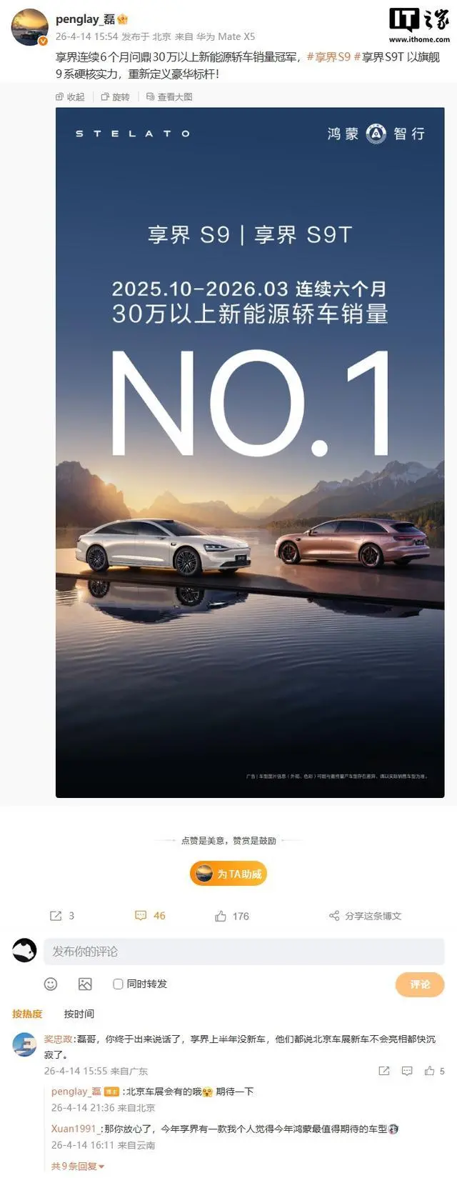 昨日,华为智选车产品总监(享界系列)彭磊在微博上宣布,享界品牌已经连续六个月成为30万元以上新能源轿车市场的销量冠军。